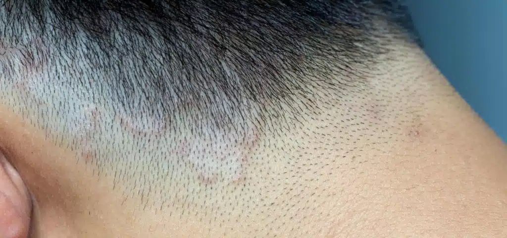 Rozprzestrzeniające się w organizmie zakażenie z czasem prowadzi do wystąpienia objawów także na twarzy i na owłosionej skórze głowy, zwłaszcza na potylicy.