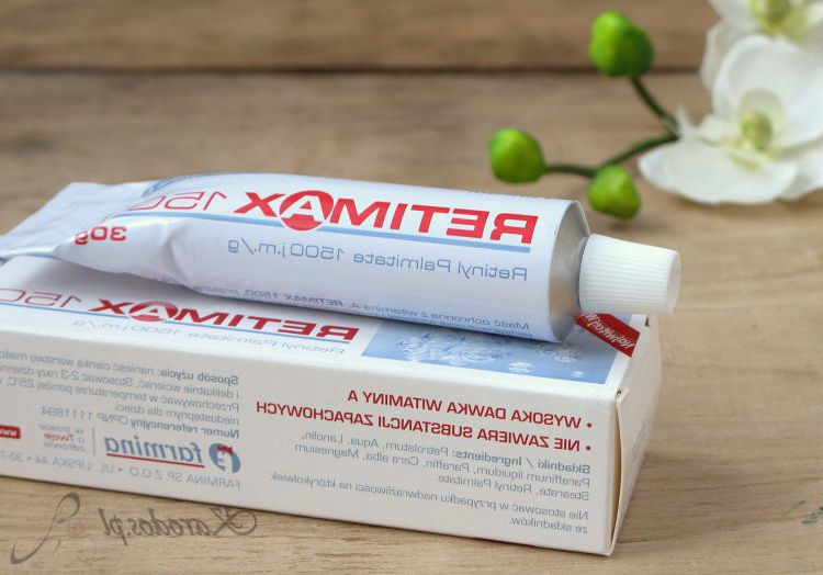 Retimax 1500 maść ochronna z witaminą A to preparat apteczny zawierający wysoką dawkę witaminy A bez recepty (występującą pod postacią palmitynianu retinolu), bo aż 1500 j.m/g. Dla porównania inne preparaty jak maść z witaminą A Askoderm zawiera jedynie 400 j.m/g, zaś wspomniana maść ochronna z witaminą A Hasco Lek – 800 j.m/g. Przyznam, że Retimax działa lepiej (mocniej) od tej z Hasco Leku. Nawet nie przeszkadza mi, że nie ma zapachu.